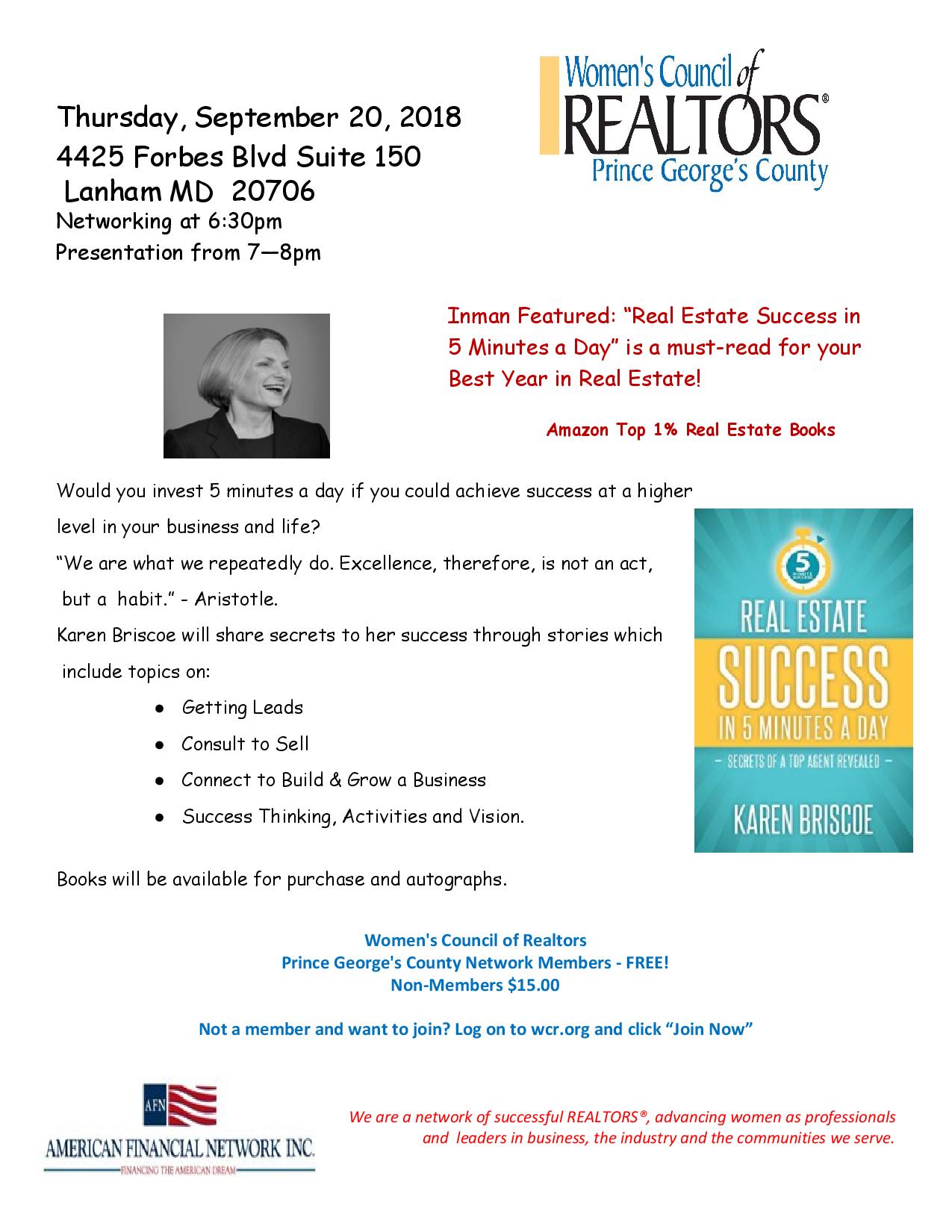 - Women’s Council of Realtors: Prince Georges County Maryland Chapter – September 20, 2018